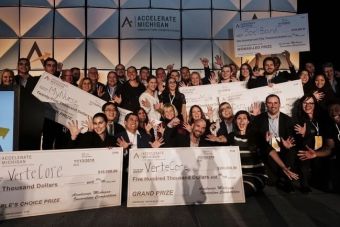 Accelerate Michigan Innovation Competition winners of a total of $1 million in cash and other prizes celebrate last November at the Lexus Velodrome in Detroit.