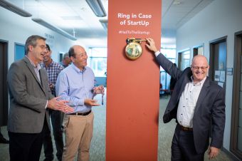 University of Michigan faculty member Peter Adriaens rings the Tech Transfer bell last year as Greg Peterson and Tad Slawecki of LimnoTech applaude. The three are partners in Equarius Risk Analytics, the first fintech company started at the university.